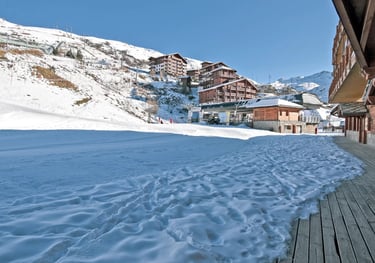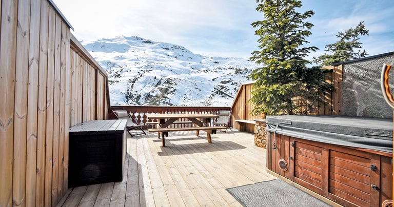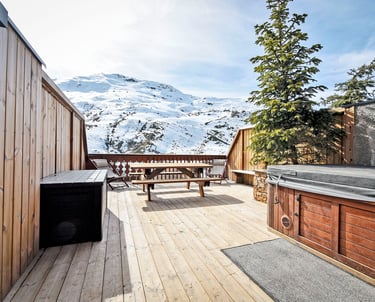 Grande terrasse de 30m² exposée Sud-Ouest équipée d'une table, de transats et d'un jacuzzi. Vue dégagée sur le massif de la Masse